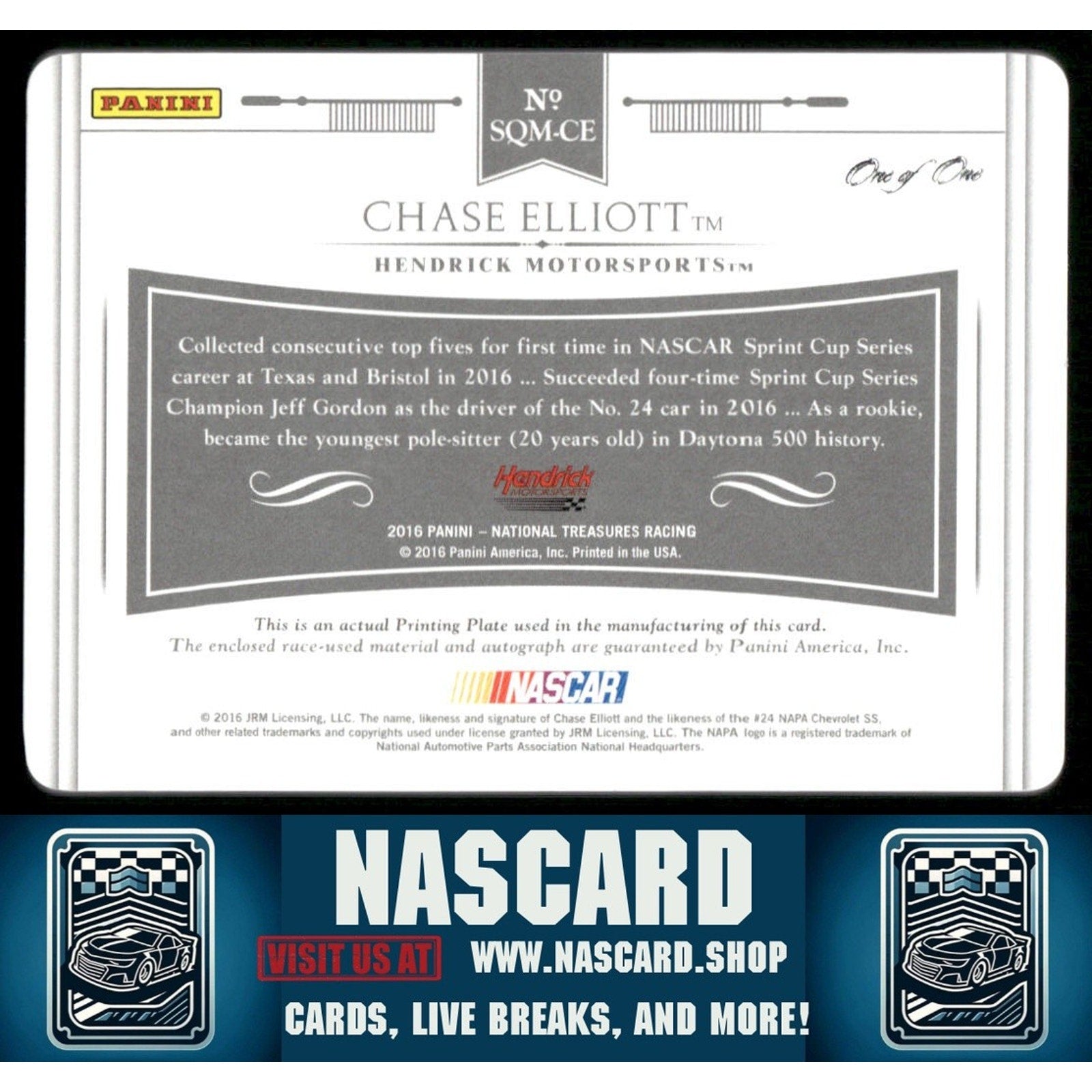 This is a nice example of a 2016 Panini National Treasures #SQM-CE Chase Elliott Signature Quad Materials - Printing Plates Magenta