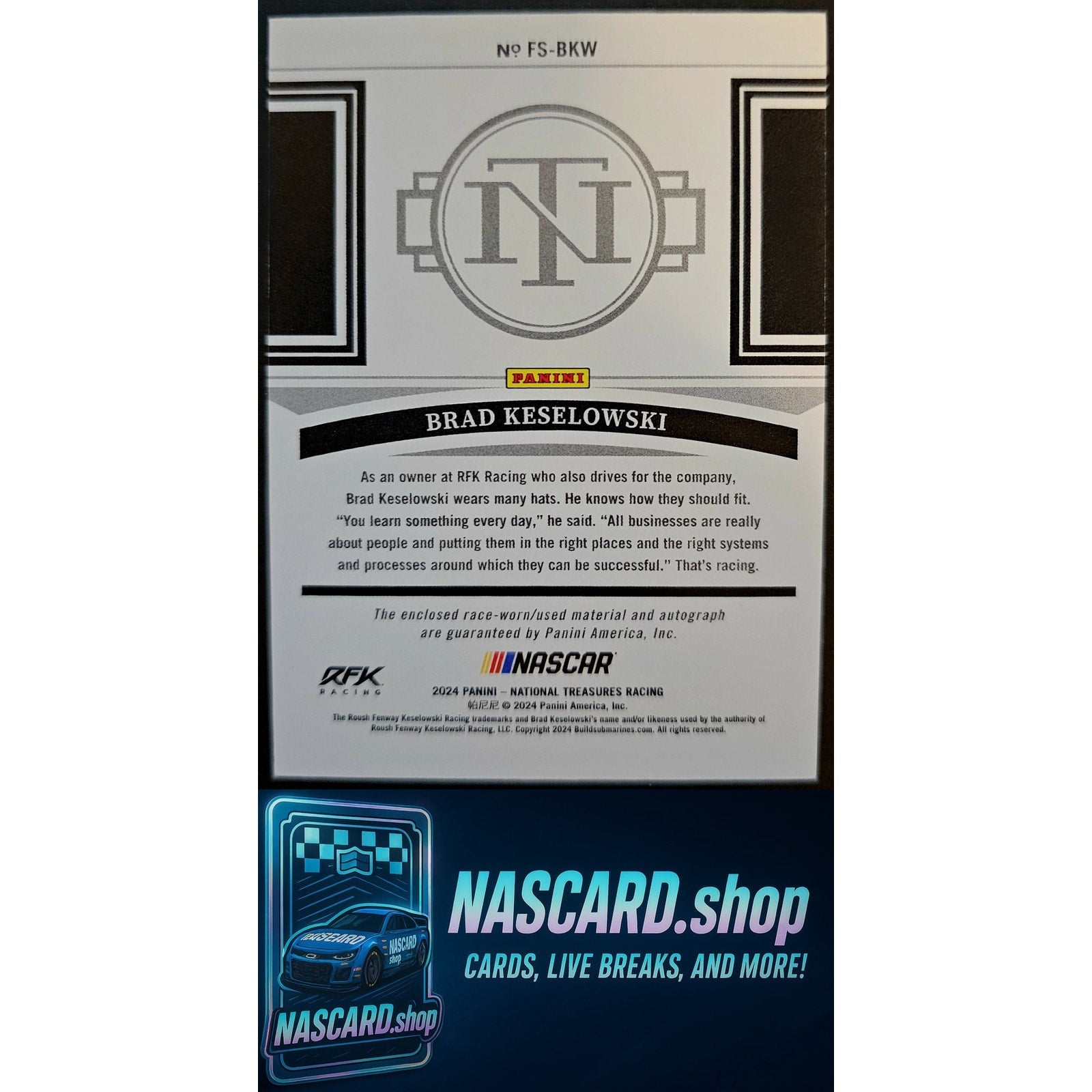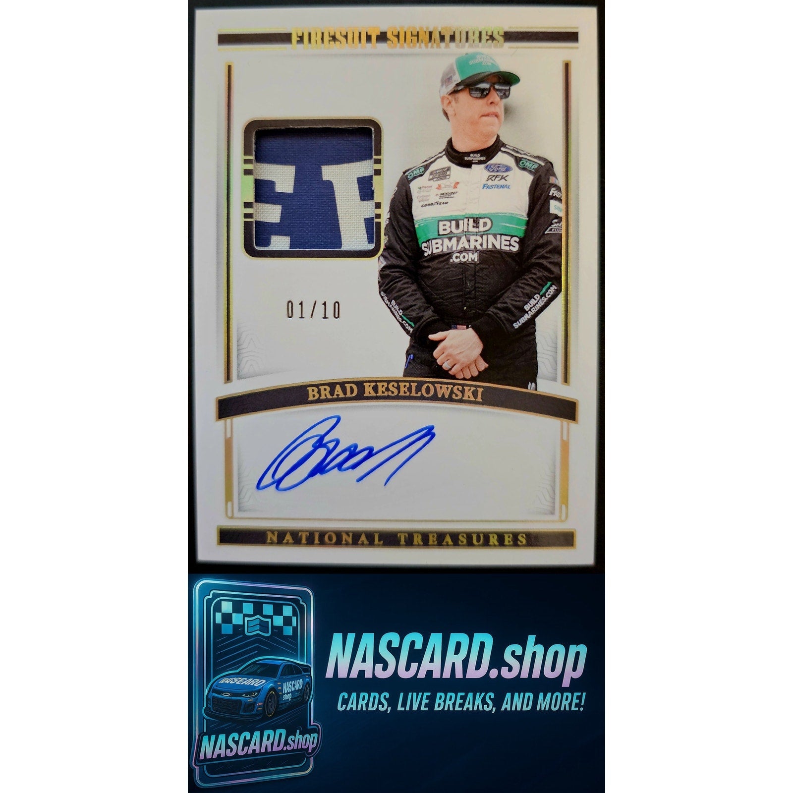 This is a nice example of a 2024 Panini National Treasures #FS-BKW Brad Keselowski Firesuit Signatures Holo Gold