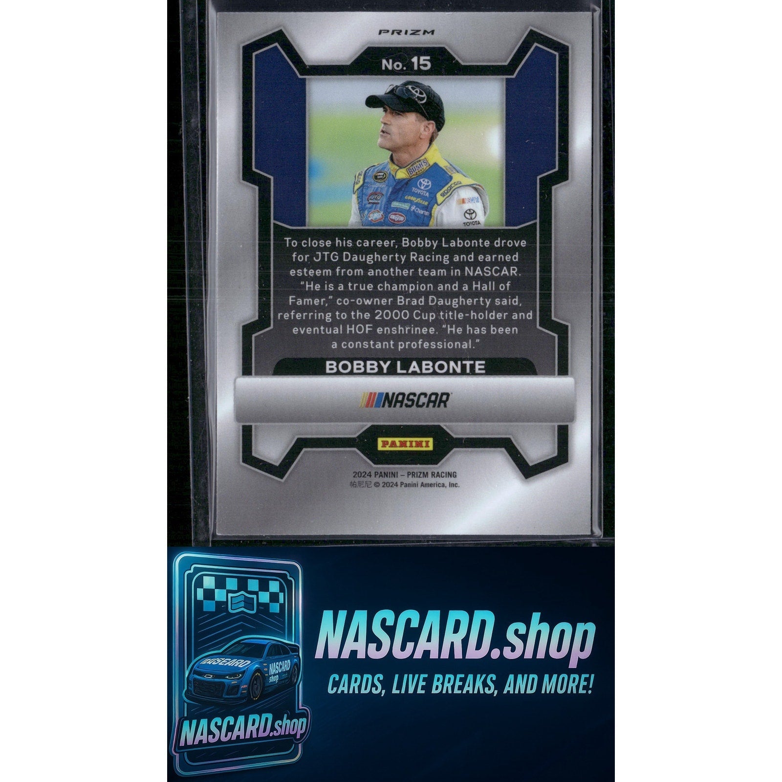This is a nice example of a 2024 Panini Prizm #15 Bobby Labonte White Sparkle