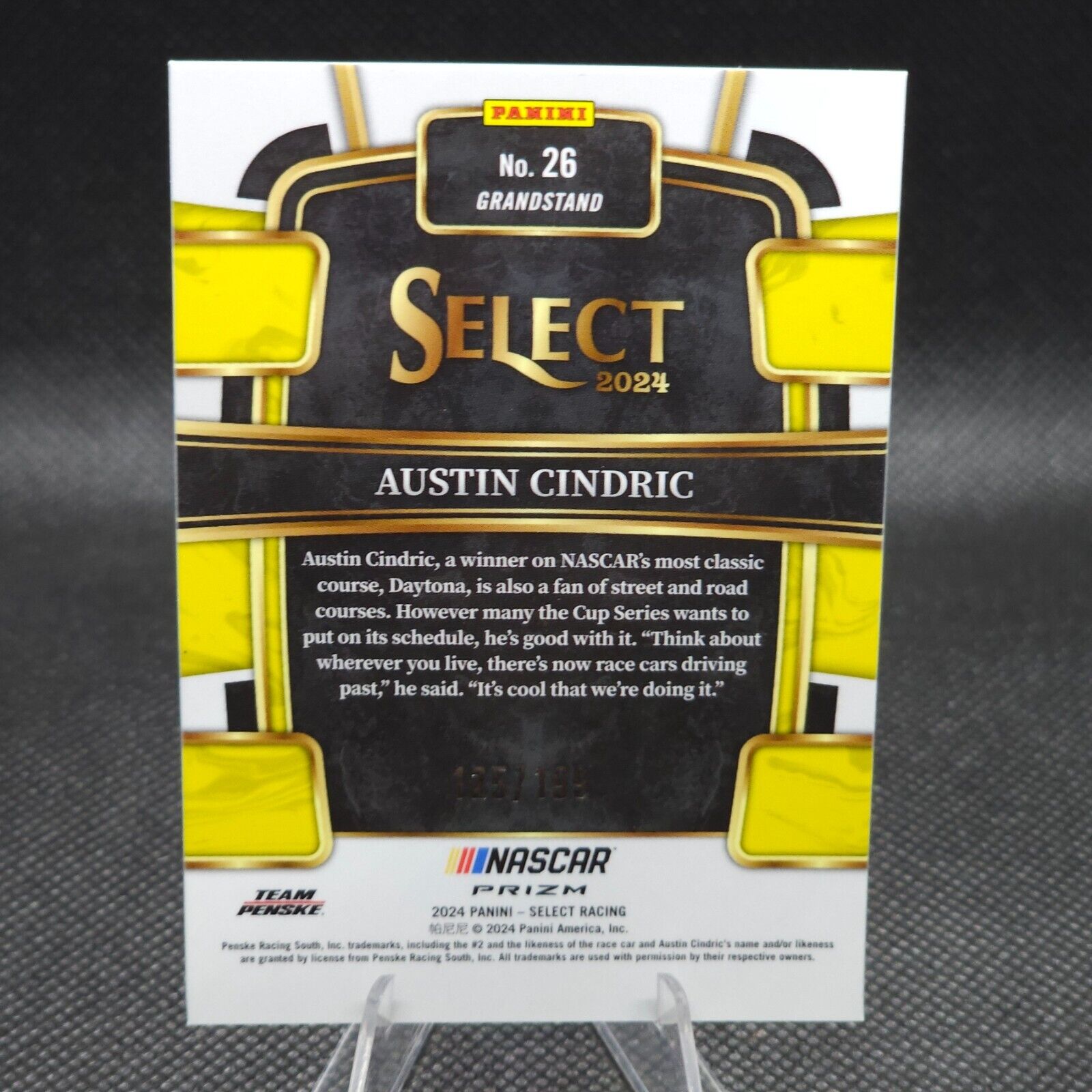 This 2024 Panini Select Racing Grandstand Light Blue Prizm #26 Austin Cindric trading card is a must-have for any NASCAR fan. With a print run of only 199, this card is a rare find and features serial numbering for added value. The card is made of high-quality card stock with a thickness of 35 Pt. and is part of the Grandstand insert set. The card showcases the talented Austin Cindric, who drives for Team Penske in the 2024 NASCAR season. It is a standard-sized sports trading card that is perfect for collectors or avid fans. The card is not autographed but does feature a beautiful Light Blue Prizm parallel/variety. Don't miss out on the opportunity to add this card to your collection.