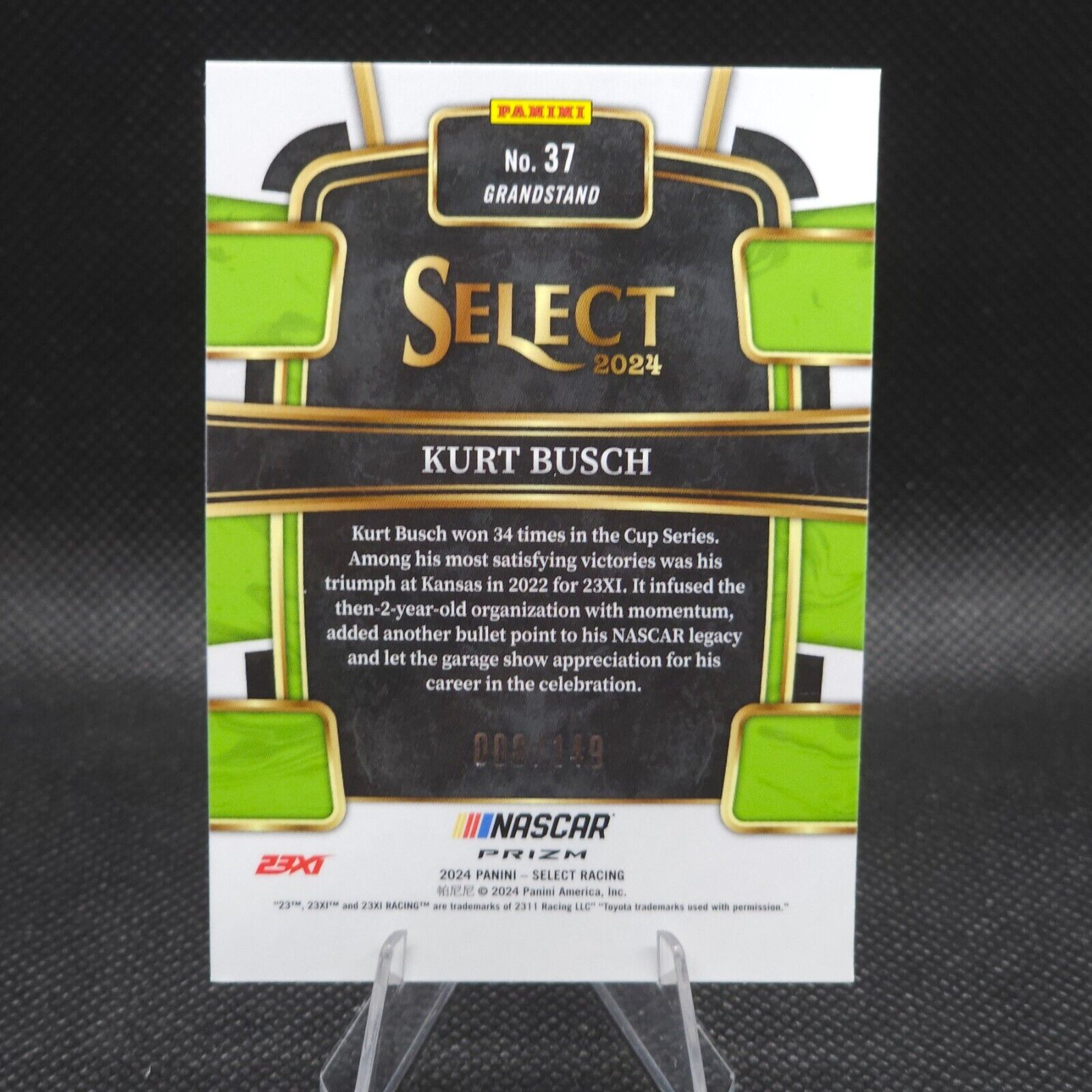 This is a 2024 Panini Select Racing Grandstand Red Prizm #37 Kurt Busch trading card. It features the NASCAR driver Kurt Busch, who races for 23XI Racing. The card is made of 35 Pt. card stock material and is part of the 2024 Panini Select set. This sports trading card is serial numbered and has a print run of 149. It is a near mint or better conditioned card and is a great addition to any auto racing fan's collection. The card is a parallel/variety of the Red Prizm and is manufactured in the United States by Panini.