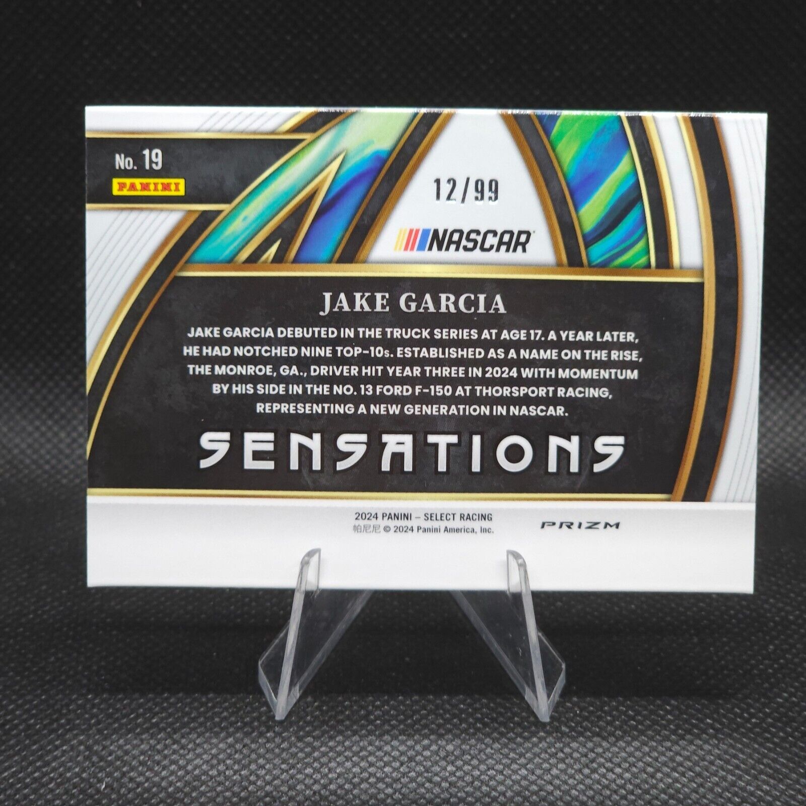 2024 Panini Select Racing Sensations Red Prizm #19 Jake Garcia 12/99 Rookie Card