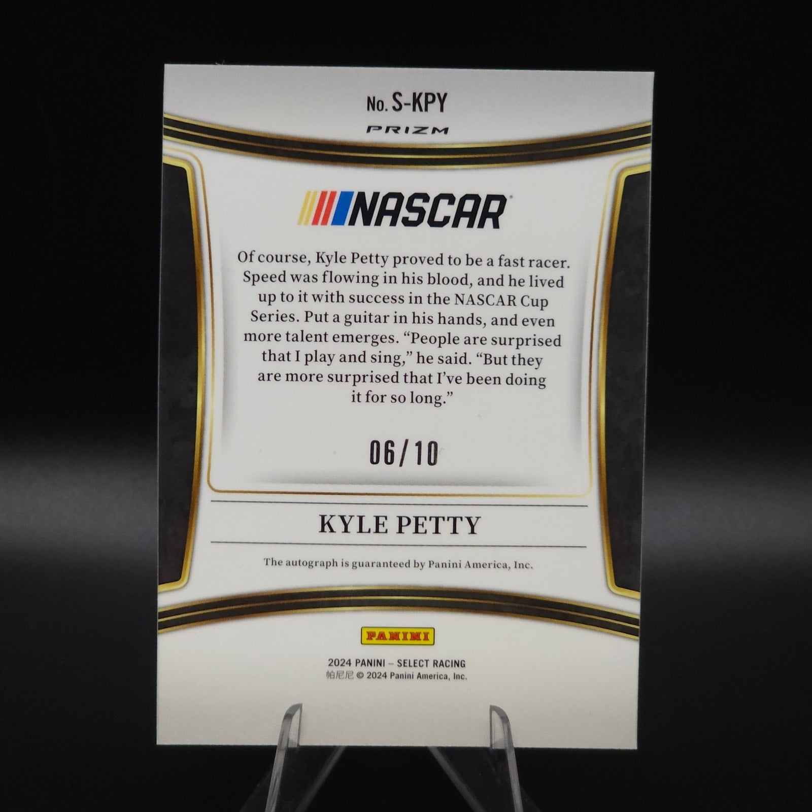 The 2024 Panini Select Racing Signatures Gold Flash Prizm #S-KPY trading card features an autograph from NASCAR legend Kyle Petty. This limited edition card is part of the Signatures insert set, with a print run of only 10 copies. It is made of 35 Pt. card stock with a label or sticker autograph format, offering a unique collectible for fans of auto racing.